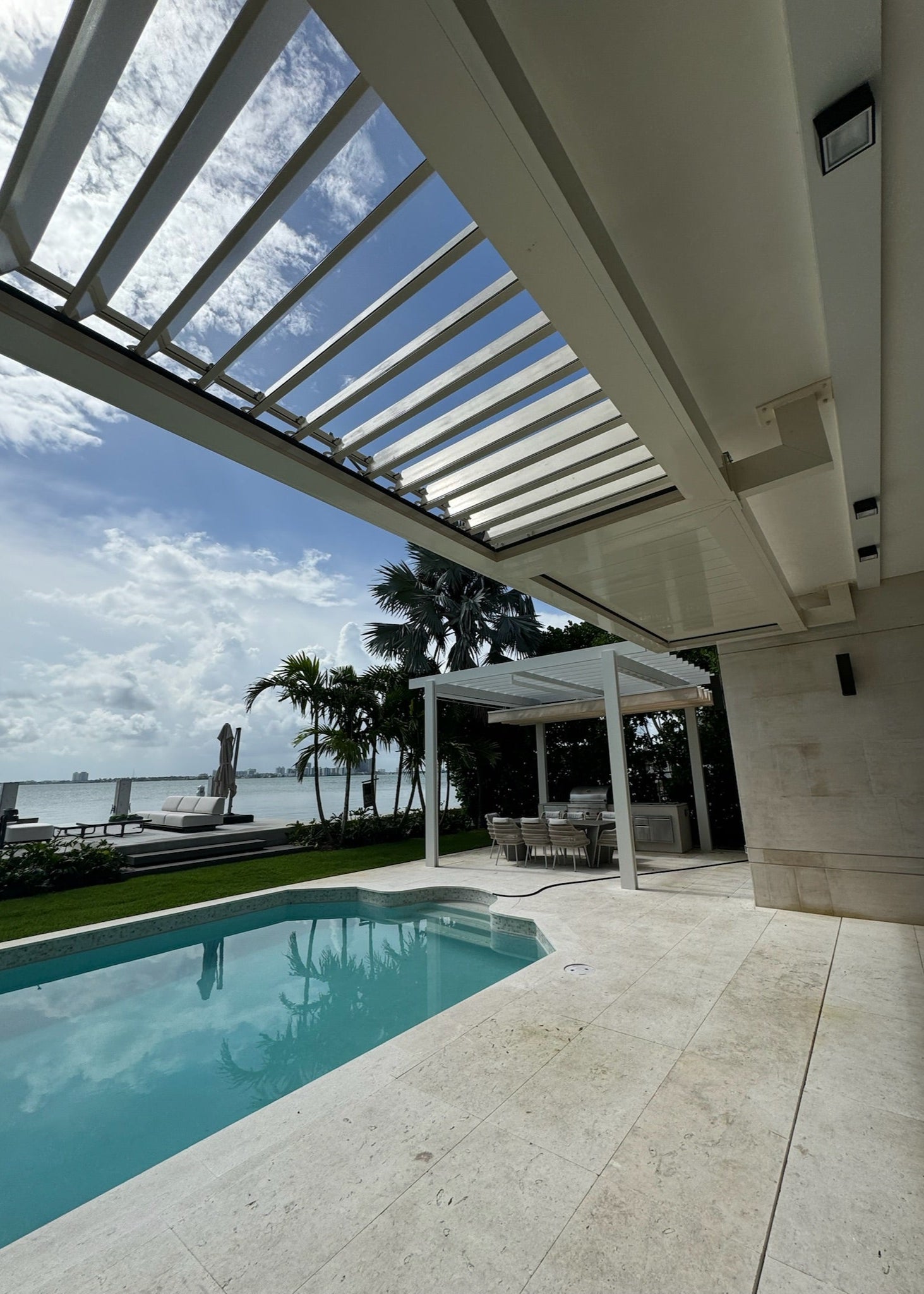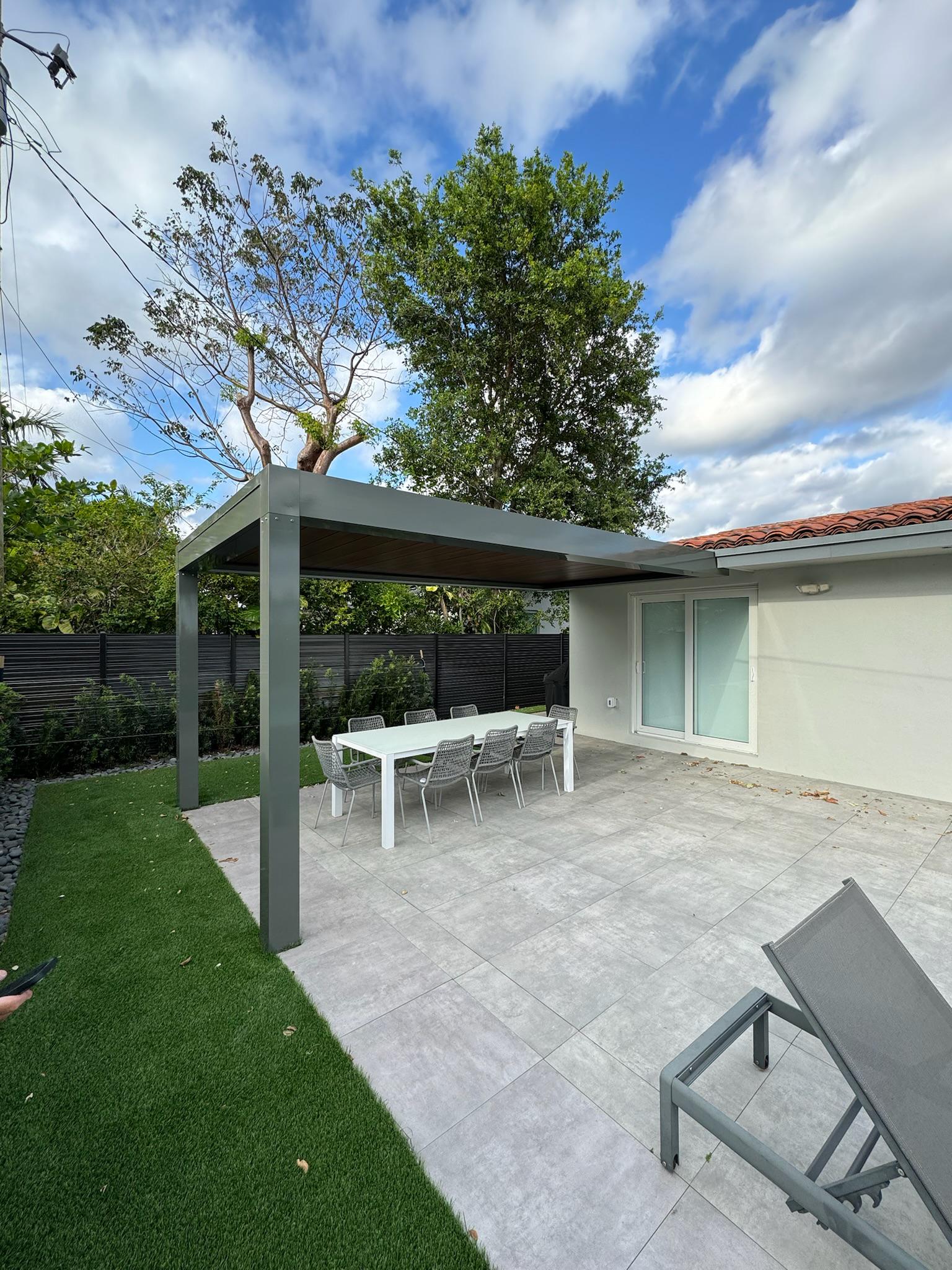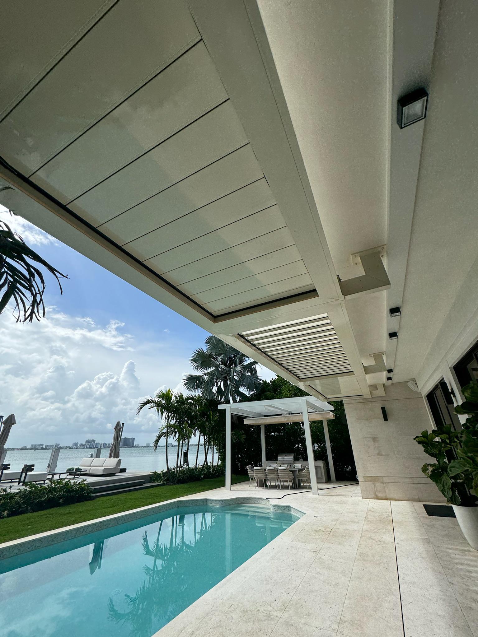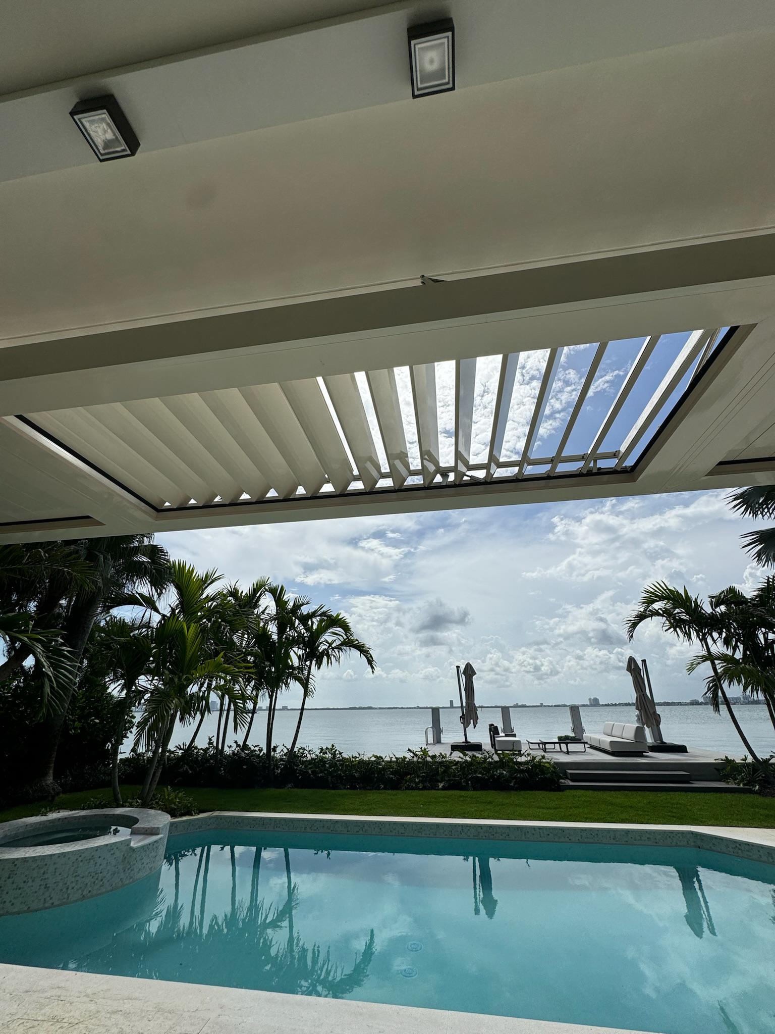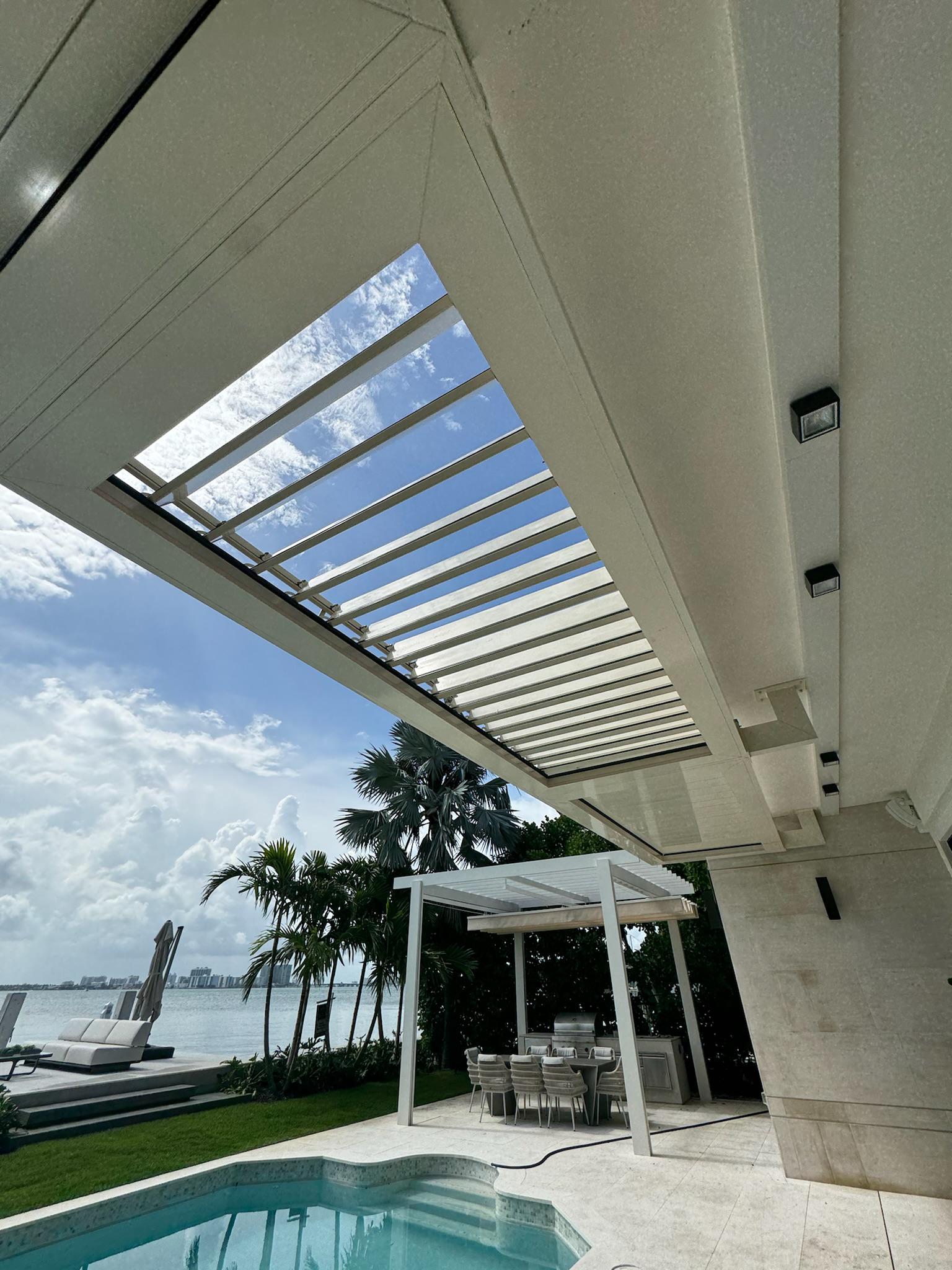 This modern pergola was constructed in Miami Beach, Florida, to provide a shaded outdoor dining and relaxation area. The project involved the installation of a sleek, white structure with a louvered roof system, perfectly complementing the contemporary design of the waterfront property.