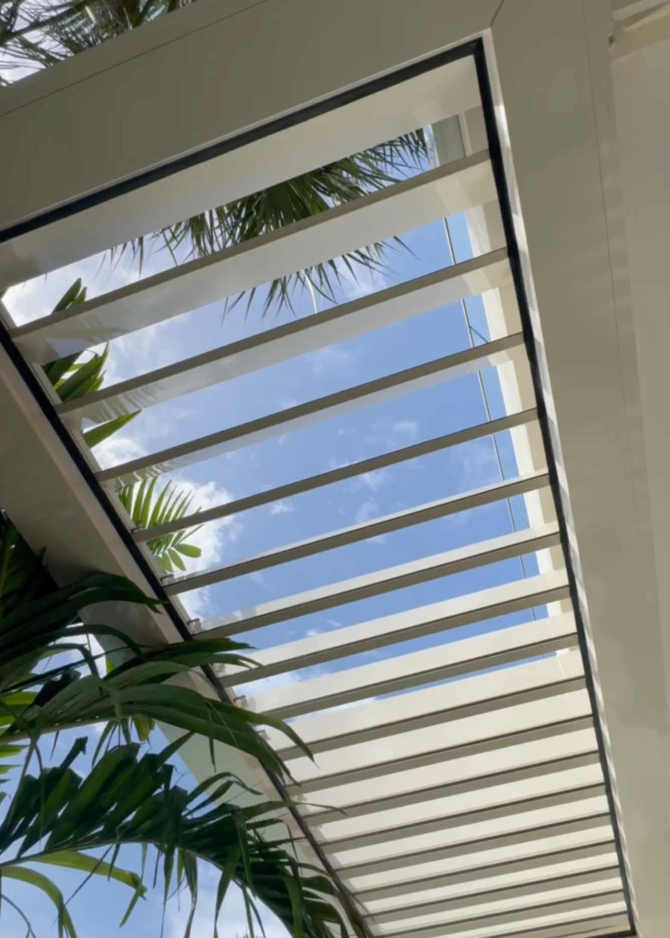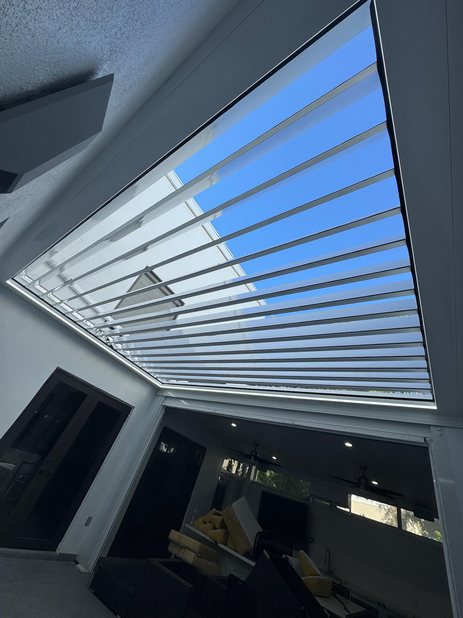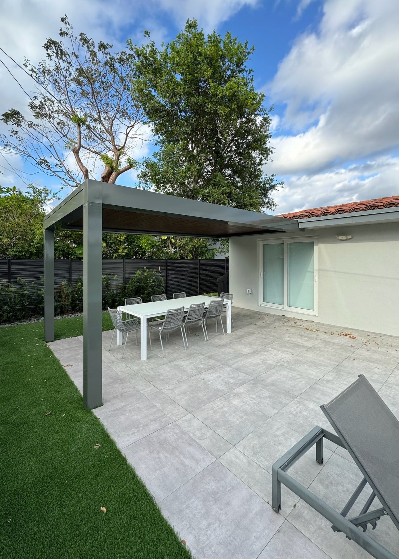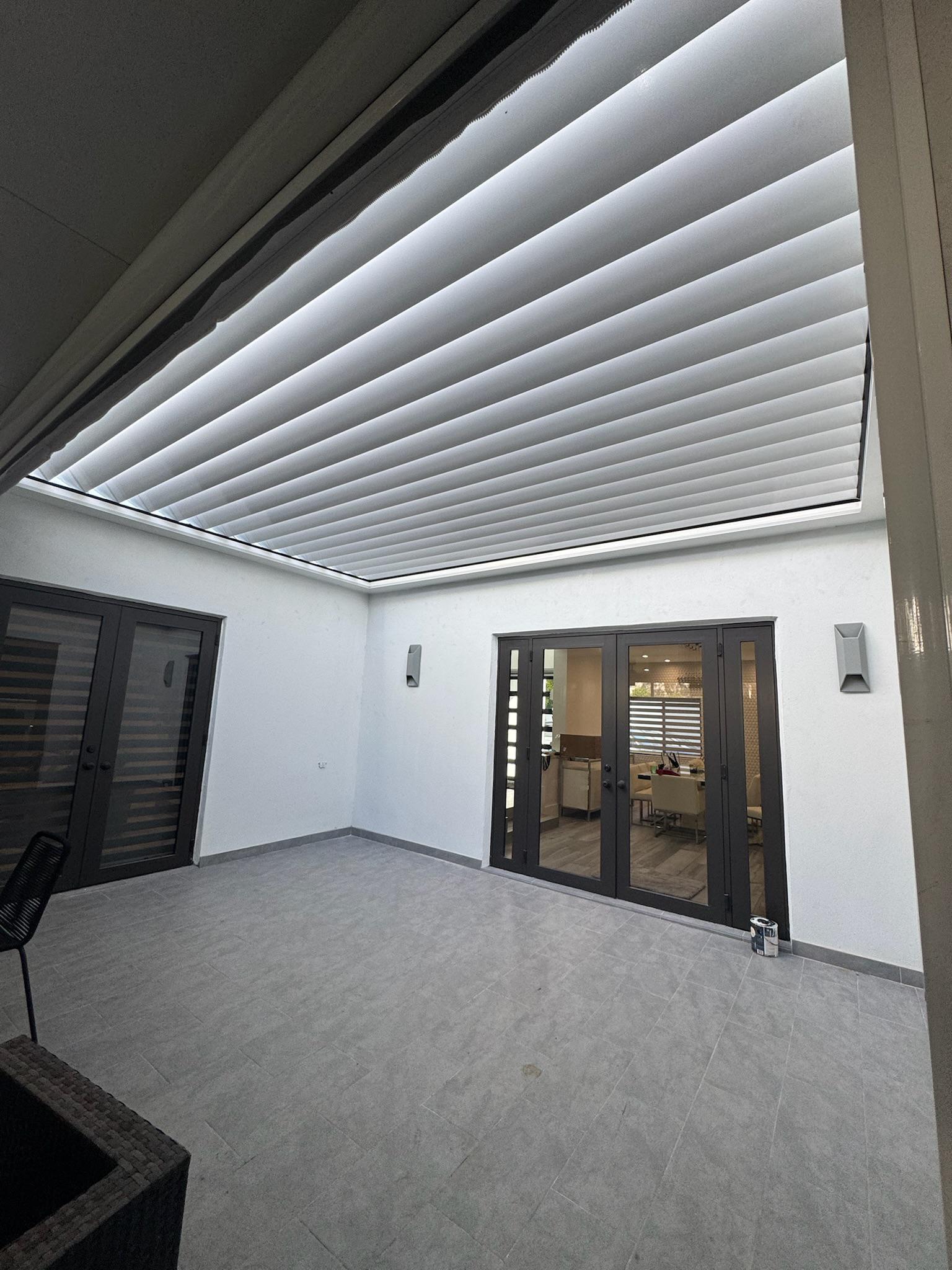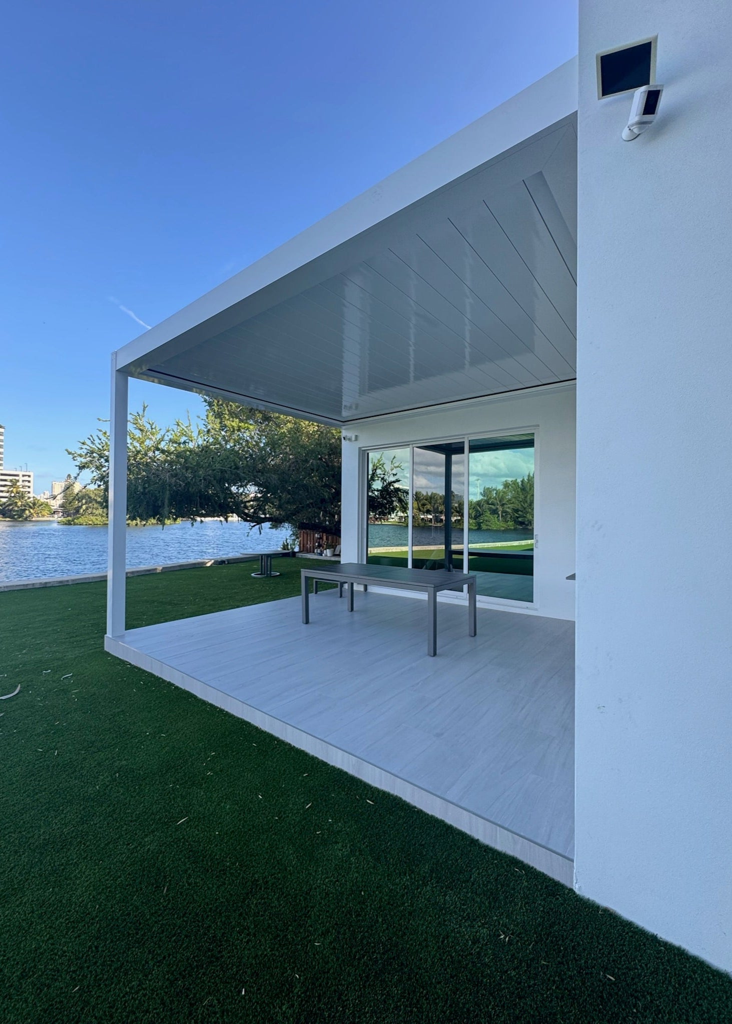 This modern pergola was constructed in Miami Beach, Florida, to provide a shaded outdoor dining and relaxation area. The project involved the installation of a sleek, white structure with a louvered roof system, perfectly complementing the contemporary design of the waterfront property.